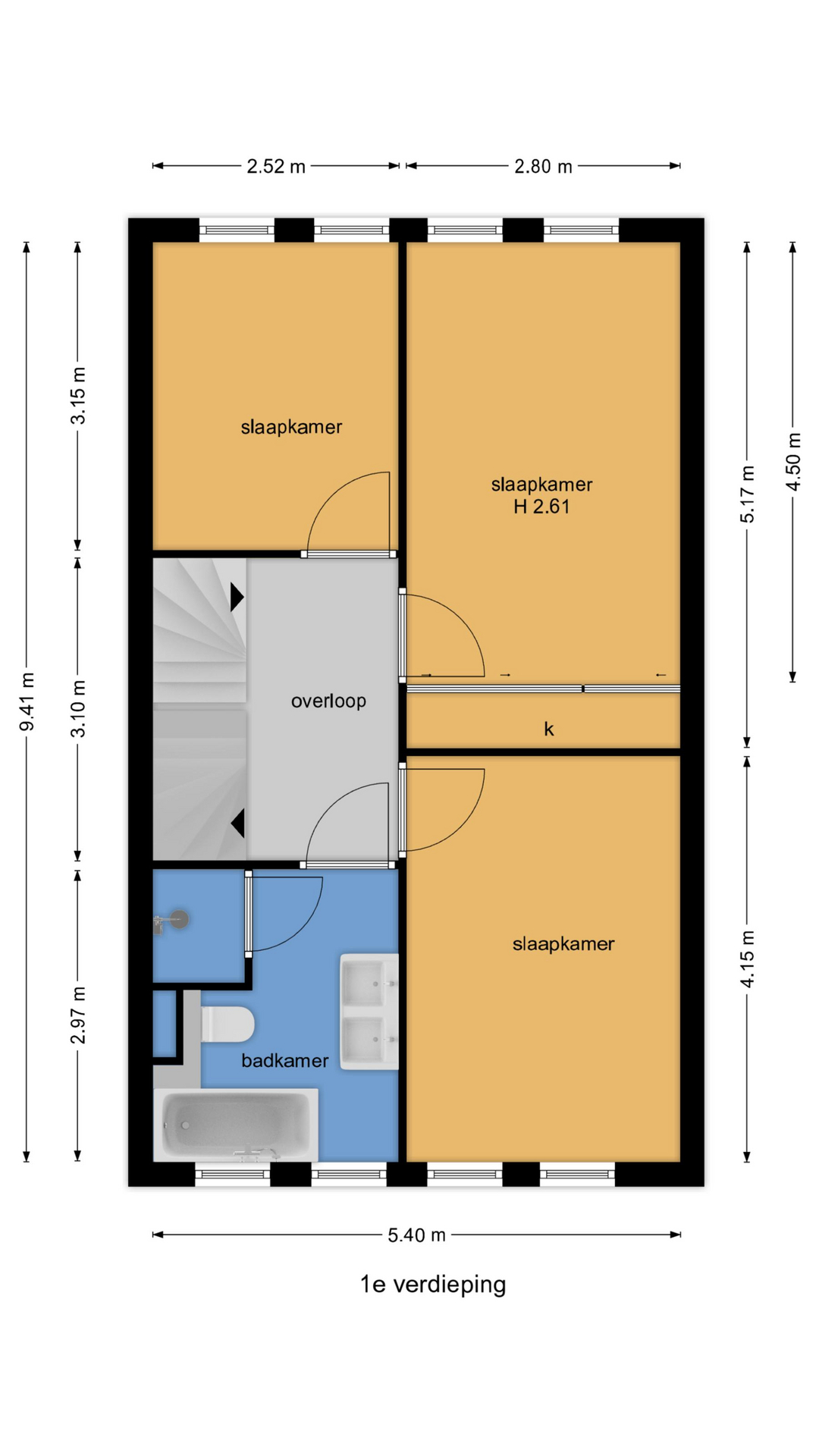 Op de eerste verdieping bevinden zich drie ruim bemeten slaapkamers met veel lichtinval, voorzien van een doorgetrokken laminaat vloer. De master bedroom aan de achterzijde, waarin gemakkelijk een lits-jumeaux bed past, beschikt over een ingebouwde schuifdeurkast.