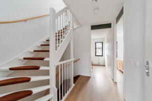 Via de betegelde voortuin, voorzien van een ruime berging, bereikt u de entree van de woning. De hal biedt toegang tot het toilet met fonteintje, de meterkast en de trap naar de verdieping. De begane grond is voorzien van een massief houten vloer.