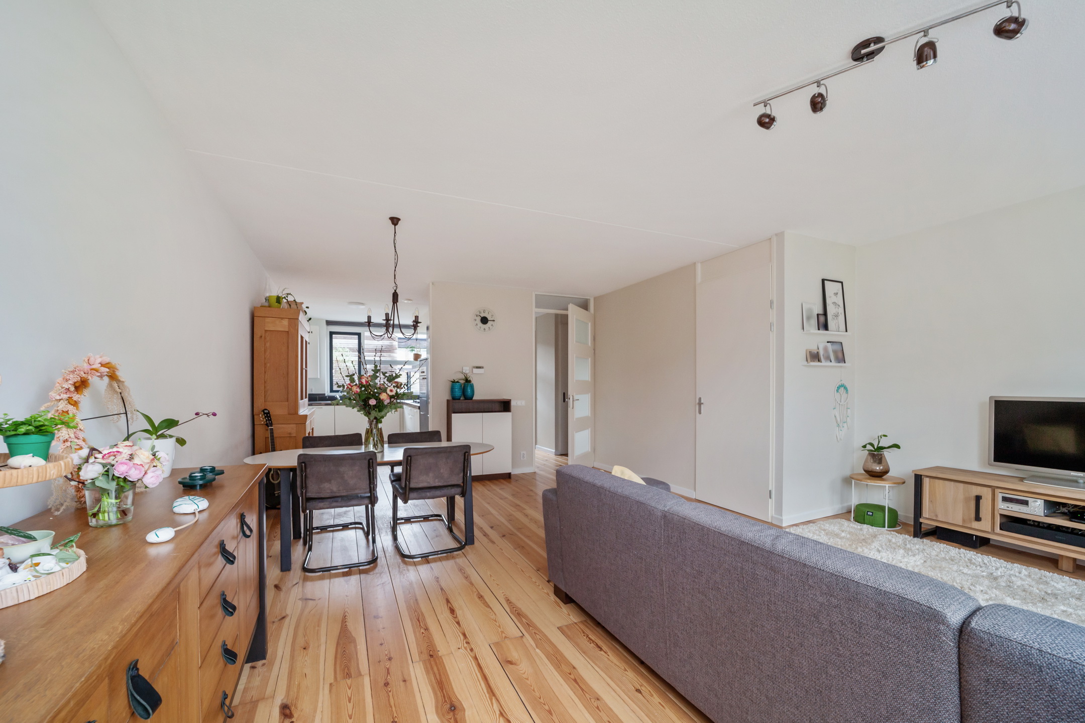 In de lichte woonkamer biedt het woon-eetgedeelte volop ruimte voor gezellige diners en ontspanning. Via de achterdeur stapt u zo de mooie groene tuin in, gelegen aan het water.