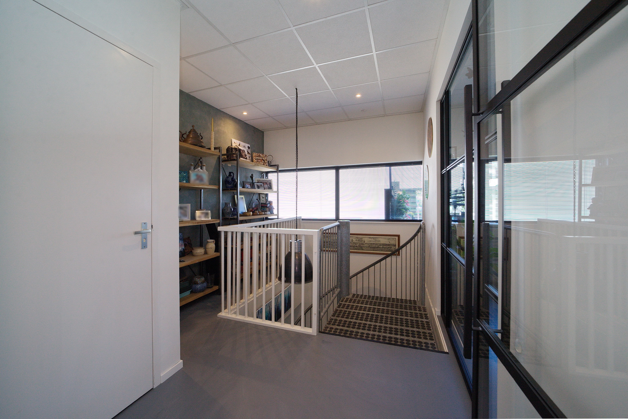 De eerste verdieping (106 m²) is volledig ingericht als representatief kantoor met moderne faciliteiten. Deze etage omvat ruime kantoorruimtes, een functionele keuken met diverse keukenapparatuur, sanitaire voorzieningen en flexibele opslagruimtes. Het aangrenzende dakterras van 43 m² biedt mogelijkheden voor pauzeruimte of zakelijke bijeenkomsten.